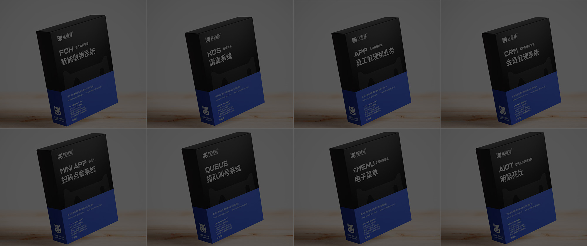 优海猫轻奢版本,包括收银点单端、扫码点餐端、排队取号大屏、CRM营销版、管理端APP等,界面优雅,完全企业美业氛围。